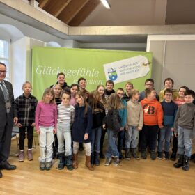 Fast hätten die beiden Schulstunden nicht ausgereicht, um alle Fragen der Kinder zu beantworten. In den Schülerköpfen hatten sich viele von den vorausgegangenen Unterrichtsstunden bekannte Inhalte mit Leben und praktischen Beispielen gefüllt. Der Klassensprecher bedankte sich bei Herrn Beck und überreichte ihm als Dank für die interessante „Schülersitzung“ ein kleines Geschenk. Der Bürgermeister führte uns anschließend noch ins Rathaus, wo er uns die verschiedenen Ämter zeigte und uns schließlich in sein Geschäftszimmer führte. Für die anstehenden Kommunalwahlen waren wir mit die ersten, die auf seinem Schreibtisch die frisch gedruckten Wahllisten bestaunen durften. Auch für jeden Schüler gab es noch ein Dankeschön des Bürgermeisters: Eine kleine Nascherei für die bevorstehende Pause.