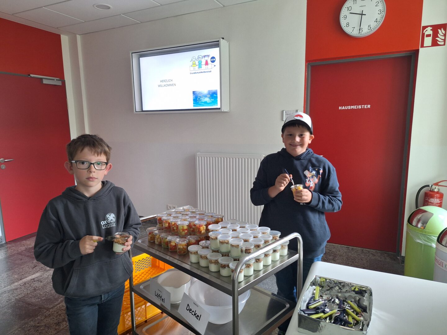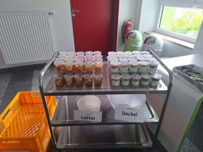 Ein­mal im Monat erhal­ten die Kin­der vom Kur­zen­trum Bad Wei­ßen­stadt ein gesun­des Pau­sen­glas mit lecke­rem Obst­sa­lat oder Joghurt mit Müs­li.