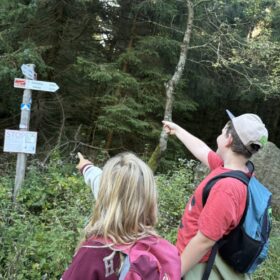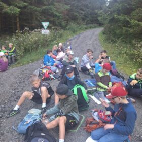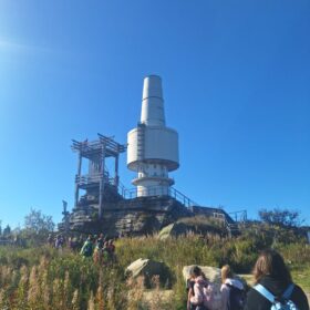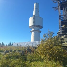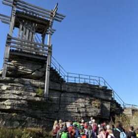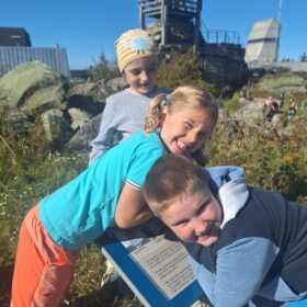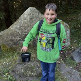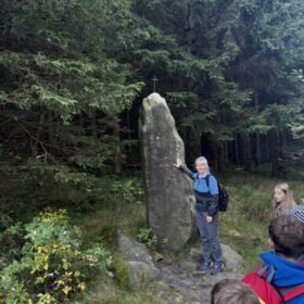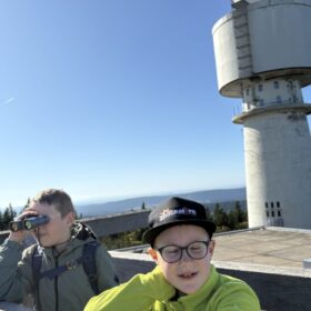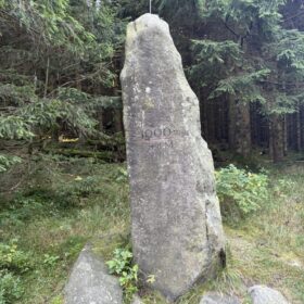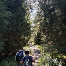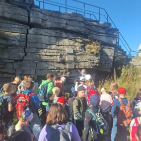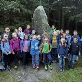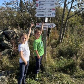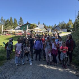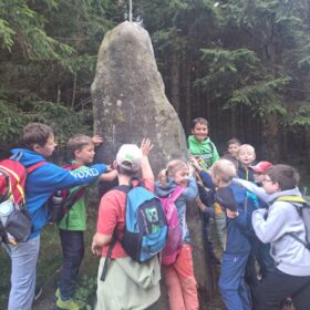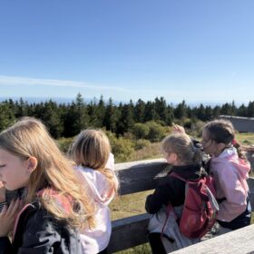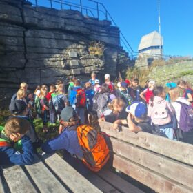 Die Dritt- und Viertklässler durften nämlich mit ihren Lehrerinnen auf den Schneeberg (1051m) wandern. Wir fuhren mit dem Bus zum Parkplatz Schneebergstraße in der Nähe der Höhenklinik. Nach knapp zweistündigem Aufstieg erreichten wir — nach einem Abstecher zum Tausendmeterstein — den Gipfel mit seinem hölzernen Aussichtstürmchen, dem „Backöfele“ und dem großen Militärturm daneben. Auf der steinernen Inschrift konnten wir lesen, dass der Aussichtsturm 1926 erbaut wurde und im Jahr 2026 bald 100 Jahre alt wird. Zunächst genossen alle in kleine Gruppen aufgeteilt, den herrlichen Rundblick. Unten im Tal lag Bischofsgrün, dahinter der Ochsenkopf (1024m) mit dem Fernsehsender. Hinter dem Fichtelsee erkannte man Fichtelberg, Neubau und Mehlmeisel. In nördlicher Richtung lag der Weißenstädter See. Dann kam der große Hunger. Fest bissen die Kinder in ihre leckeren Brotschnitten und tranken aus ihren Getränkeflaschen. Gestärkt konnten wir nun den Abstieg in Angriff nehmen. Lukas fand beim Zusammenpacken hinter einem Stein im Moos ein Geocache, das eigentlich selten zu finden ist. Wir trugen in das Begleitbüchlein unseren Schulnamen und das Datum ein und legten das Gefäß für andere findige Wanderer zurück an den versteckten Fundort. Nun machten wir uns auf den Weg zur Unterkunftshütte Seehaus. Unterwegs begegneten wir einem herrenlos herumlaufenden Hund, der uns auf unserem Wanderweg begleitete. Obwohl einigen dabei etwas mulmig zumute war, kamen wir wohlbehalten am Seehaus an und lieferten ihn dort ab. Die Hüttenwirtin nahm ihn an eine Leine und versorgte ihn. Sie versprach uns, den Besitzer ausfindig zu machen, was ihr auch später gelang. Schade, dass wir schnell wieder aufbrechen mussten, denn am Seehausparkplatz an der B303 wartete der Bus und brachte uns mit vielen unvergesslichen Eindrücken und Erlebnissen wieder zur Schule zurück.