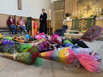 Pfarrer Fischer hieß die Schülerinnen und Schüler herzlich Willkommen. Er bewunderte alle farbigen Schultüten, die die Kinder vor den Altar legen durften.