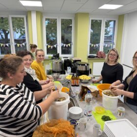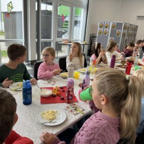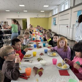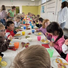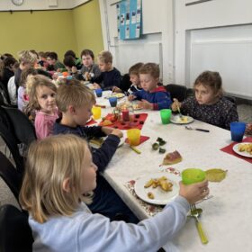 Gemeinsam sangen wir den Kartoffel-Song und dann ließen sich alle die leckeren Kartoffelgerichte schmecken, die Mamas und Papas für uns in der Zwischenzeit in der Schulküche zubereitet haben – welch ein schönes Fest!