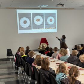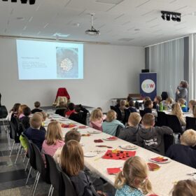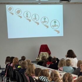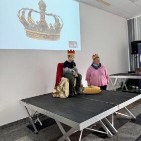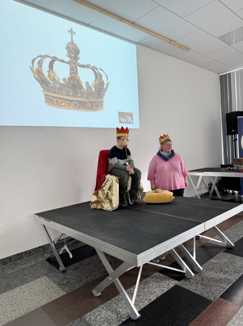Am Donnerstag, 16. Oktober 2025 feierte gut gelaunt die Schulfamilie das diesjährige Kartoffelfest in der herbstlich geschmückten Aula. Frau Hofmann-Geistlinger berichtete aus dem grünen Klassenzimmer und zeigte das Stecken und Ernten der Kartoffeln. 1,9 Kilogramm kamen zusammen. Die Kinder lauschten gebannt den Ausführungen über das Wachstum und Herkunft der Kartoffel. In einer Geschichte vorgetragen von Frau Kastl lernten die Schülerinnen und Schüler den Kompostfranzi kennen und die wichtige Aufgabe die Würmer für uns verrichten. Mit kleinen Filmchen aus unserer Wurmkiste im Pausenhof wurde die Arbeit der Würmer sichtbar. Nach dem Vortrag wurde es feierlich, die Krönungsmusik erklang und Frau Wagner mit Elias I und Jette I schritten mit Krone und Zepter zu unserem neuen Kartoffelkönig – Georg I und krönten ihn.
