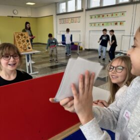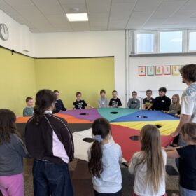 Im weiteren Verlauf spielten die Kinder verschiedene kooperative Spiele. Besonders eindrucksvoll war eine Übung mit einem großen Schwungtuch, an dem alle gemeinsam festhielten. Dabei wurde schnell deutlich, dass ein gutes Zusammenspiel nur dann funktioniert, wenn man miteinander spricht, sich abstimmt und aufeinander achtet.